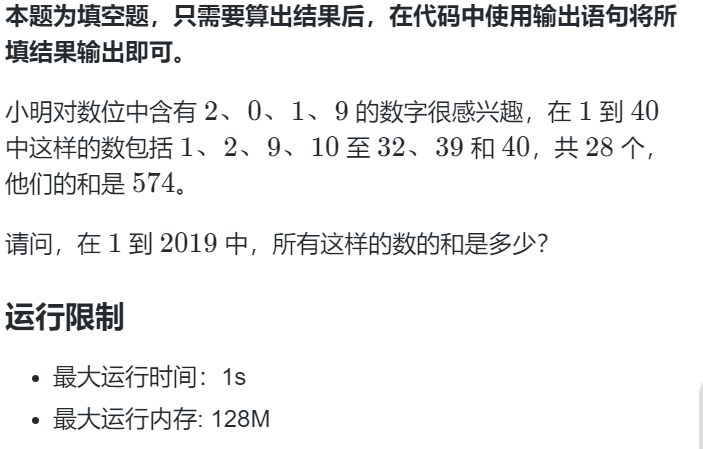 import java.util.Scanner; //1:无需package //2: 类名必须Main, 不可修改 public class Main { public static void main(String[] args) { Scanner scan = new Scanner(System.in); //在此输入您的代码... for(int i=1900;i<=2014;i++){ if(cal(i)==2014-i){ System.out.println(i); break; } } scan.close(); } public static int cal(int num){ int sum=0; while(num>0){ sum+=num%10; num/=10; } return sum; } }