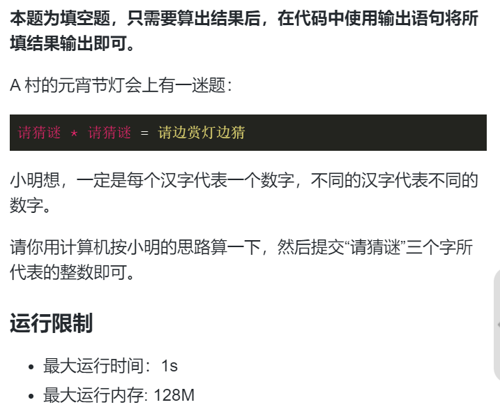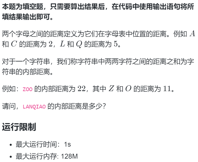 目录前言: 一、ASC分析代码实现二、 卡片分析代码实现三、 直线分析代码实现四、货物摆放分析代码实现小结:前言: 在刷题的过程中,发现蓝桥杯的题目和力扣的差别很大。让人有一种不一样的感觉,蓝桥杯题目偏向对于实际问题用编程去的解决,而力扣给人感觉很锻炼自己的编程思维,逻辑能力。两者结合去刷,相信会有不一样的收获。 一、ASC 已知大写字母A的ASCII码为65,请问大写字母L的ASCII码是多少?分析 这道题目看上去很简单,我们需确定自己计算的准确,所以我建议用编程去解决。代码实现publicclassTest8{publicstaticvoidmain(String[]args){Sy