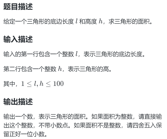 import java.util.Scanner; // 1:无需package // 2: 类名必须Main, 不可修改 public class Main { public static void main(String[] args) { double a=Math.sqrt((6.4-2.3)*(6.4-2.3)+(3.1-2.5)*(3.1-2.5)); double b=Math.sqrt((6.4-5.1)*(6.4-5.1)+(3.1-7.2)*(3.1-7.2)); double c=Math.sqrt((5.1-2.3)*(5.1-2.3)+(7.2-2.5)*(7.2-2.5)); double p=(a+b+c)/2; System.out.println(String.format("%.3f", Math.sqrt(p*(p-a)*(p-b)*(p-c)))); } }