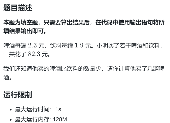 import java.util.Scanner; // 1:无需package // 2: 类名必须Main, 不可修改 public class Main { public static void main(String[] args) { for(int j = 2; j<43; j++){ for(int i=1; i<j; i++){ if(1.9*j+2.3*i==82.3){ System.out.println(i); return; } } } } }
