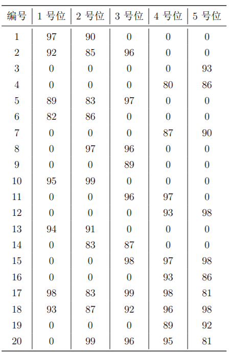 每位球员担任 1 号位至 5 号位时的评分如下表所示。请你计算首发阵容 1号位至 5 号位的评分之和最大可能是多少?