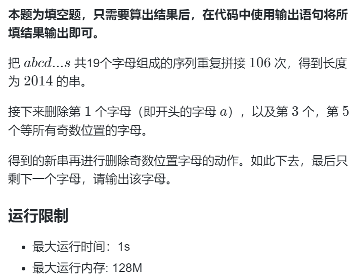 import java.util.Scanner; // 1:无需package // 2: 类名必须Main, 不可修改 public class Main { public static void main(String[] args) { String s = ""; for(int i=1;i<=106;i++) { s = s+ "abcdefghijklmnopqrs"; } String t = ""; while(s.length()!=1) { t = ""; for(int i=1;i<s.length();i=i+2) { t = t + s.charAt(i); } s = t; } System.out.println(s); } }