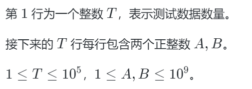 import java.util.Scanner; // 1:无需package // 2: 类名必须Main, 不可修改 public class Main { public static void main(String[] args) { Scanner scan = new Scanner(System.in); //在此输入您的代码... int n= scan.nextInt(); for(int i=0;i<n;i++){ int a=scan.nextInt(); int b=scan.nextInt(); System.out.println(gcd(a,b)); } scan.close(); } //求两个最大的公约数 差不多成为一个公用的模板了 public static int gcd(int a,int b){ if(b==0)return a; return gcd(b,a%b); } }