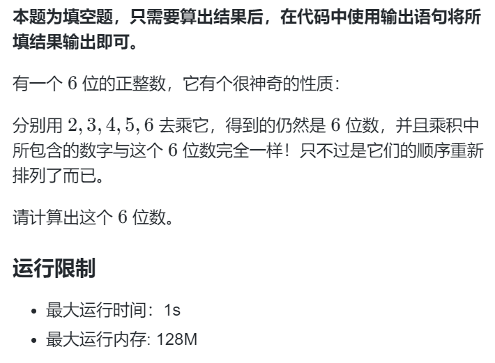 import java.util.Arrays; import java.util.Scanner; //1:无需package //2: 类名必须Main, 不可修改 public class Main { public static void main(String[] args) { Scanner scan = new Scanner(System.in); //在此输入您的代码... for(int i=100000;i<=166666;i++) { String a0=sort((i)); String a1=sort((2*i)); String a2=sort((3*i)); String a3=sort((4*i)); String a4=sort((5*i)); String a5=sort((6*i)); if((a0+a1+a2+a3+a4+a5).equals(a0+a0+a0+a0+a0+a0)) { System.out.println(i); } } scan.close(); } public static String sort(int NUM){ String res=NUM+""; if(res.length()>6) { return "----"; } char temp[]=res.toCharArray(); Arrays.sort(temp); String result=""; for(int i:temp) {; result=result+(i-'0'); } return result; } }