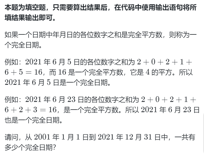 import java.text.SimpleDateFormat; import java.util.*; public class Main { public static int getDate(Date s) { SimpleDateFormat sdf=new SimpleDateFormat("yyyyMMdd"); String temp= sdf.format(s).toString(); char num[]=temp.toCharArray(); int sum=0; for(char i :num) { sum=sum+i-'0'; } return sum; } public static void main(String[] args) { int res=0; Calendar cal=Calendar.getInstance(); cal.set(2001, 0, 1); Calendar cale=Calendar.getInstance(); cale.set(2022,0,0 ); while(cal.before(cale)) { int num=(int) Math.sqrt(getDate(cal.getTime())); if(Math.sqrt(getDate(cal.getTime()))==num) { res++; } cal.add(Calendar.DAY_OF_MONTH, 1); } System.out.println(res); } }