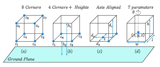 bbox的参数表示:主要的表示方法有以下的四种,用的最多的是最后一种,即使用中心点的坐标以及框的尺寸+一个偏航角这种7个参数的表示法。
